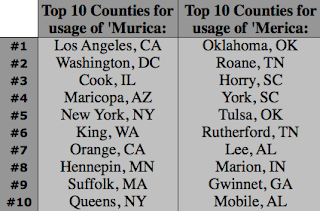 But perhaps the most interesting (and actually rather methodologically valid) ways of examining the data is to simply look at a ranked list of the top ten counties for each term. One sees here that the top ten counties for 'Merica are almost exclusively in the South, while the top ten counties for 'Murica are outside the South and within large metropolitan areas. So, our working hypothesis (which we suggest you discuss over beer and burgers on this fine day), is that 'Murica is likely a derivative of 'Merica, used ironically by slow-pour-coffee-drinking, skinny-jean-wearing hipsters in big cities. Our extensive examination of hipsters (n=1) confirms this hypothesis and places the epicenter of this plague somewhere in the Greater Boston area. But you can probably spell it however you'd like.